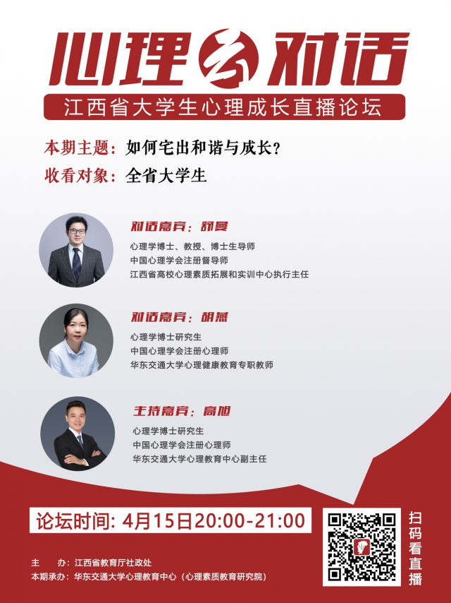 4月15日,我院心理咨询中心组织全院学生观看了第一期“心理云对话”大学生心理成长直播论坛。本期直播论坛由华东交通大学心理教育中心承办,以“如何宅出和谐与成长?”为主题,华东交通大学舒曼、胡燕、高旭三位博士给全省大学生带来了一场特殊的心灵对话。