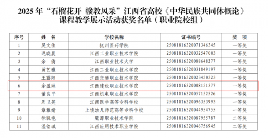 近日,江西省教育厅公布了2025年“石榴花开 赣教风采”江西省高校《中华民族共同体概论》课程教学展示活动的评选结果。在此次评选中,我校马克思主义学院余盈琳老师荣获职业院校组一等奖。