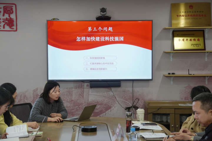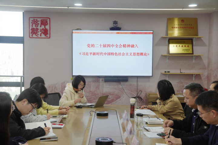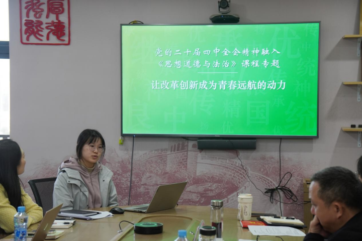 备课会上,朱晓露以党的二十届四中全会公报和“十五五”规划建议等重要文件为遵循,系统梳理了全会精神融入《习近平新时代中国特色社会主义思想概论》课程的对接点,为后续教学融入打下了扎实理论基础。钟洪波以“怎样加快建设科技强国”为题进行教学展示,详细阐释了如何将“加快高水平科技自立自强、引领发展新质生产力”有机融入课程。李婷则围绕“让改革创新成为青春远航的动力”,提前开展学情分析,结合家具设计与制造专业特色进行教学设计,推动全会精神贴近学生专业认知、激发情感共鸣。